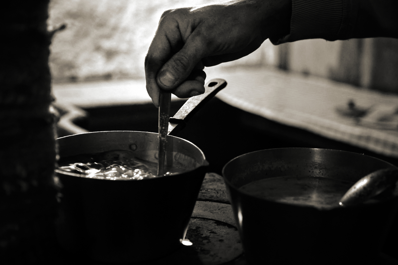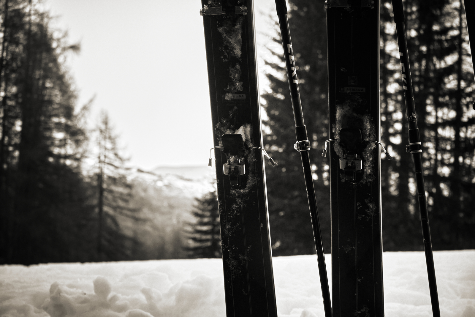 Il bianco e nero della Neopan non aggiunge nulla, ma restituisce tutto: la solitudine del singolo immerso nel bosco, il gesto essenziale di una mano che prepara un pasto caldo dopo ore di cammino, il riposo degli sci appoggiati a un albero scheletrico, testimoni di una giornata tra neve e cielo.